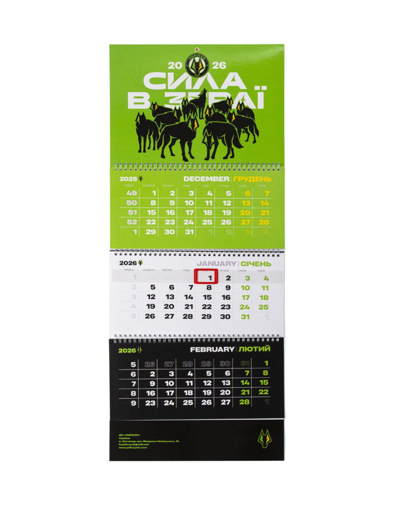 Календар квартальний ФК “Полісся” – це зручний та стильний настінний календар, розроблений із врахуванням потреб користувачів. Він складається з трьох основних блоків, з’єднаних між собою міцною пружиною чорного кольору.