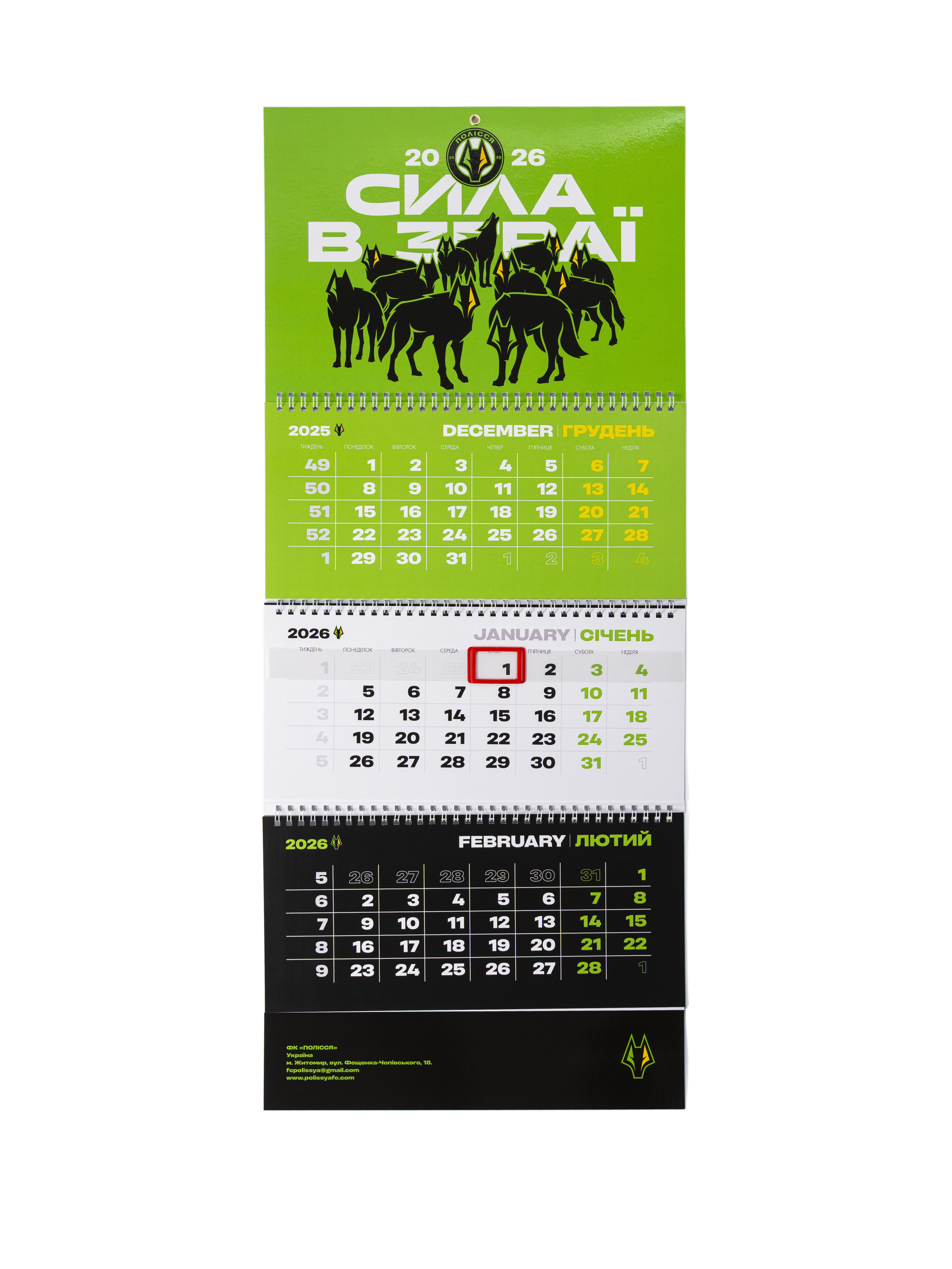 – Конструкція: Верхній блок (шапка) та нижнє поле виконані з якісною повнокольоровою печаткою. Три місяці на розвороті, зверху минулий, по центру поточний, нижній наступний місяць. На шапці встановлений люверс, що дозволяє легко закріпити календар на стіні.